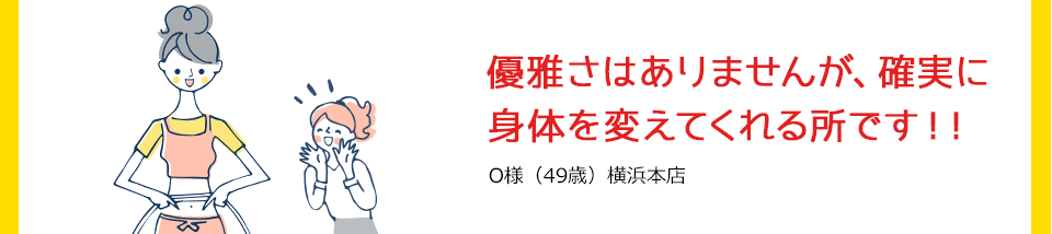 ジム通いをしていて、筋肉をつけてやせようと思っていましたが、全身ムラなくいかつい感じになってしまいました。必要な部分の筋肉は残し、必要のない脂肪を落とすことでメリハリのある健康的な身体になりたいと思いエルセーヌへ。サロン的な優雅さはなく、ある意味“道場”のようですが、確実に身体を変えてくれる所です!!(016)