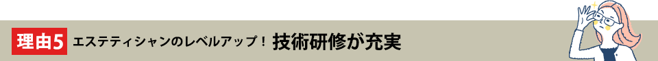 エステティシャンの技術レベルを高めるために、店内研修、地域研修、全国研修などで日々スキルアップを図っています。また、身体のしくみや栄養学についても研修し、お客様の健康で美しいボディづくりのためのアドバイスを行っています。